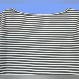 MAX STUDIO HORIZONTAL GREY/WHITE STRIPED TOP WITH 3/4 LENGTH BELL-SLEEVES AND A ROUND NECK. SLIGHTLY LONGER IN THE BACK THAN THE FRONT. SOFT COMFORTABLE KNIT FABRIC..