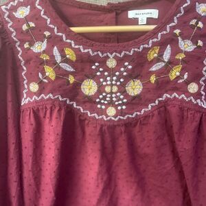 boho maroon burgundy red intricately embroidered at the chest with multicolor floral motif 3 button back, elastic balloon sleeves oversized flowy top