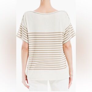 Stylish short sleeve top with beige and tan stripes from Max Studio, size L, features a boat neckline and split hem and is perfect for casual wear.
