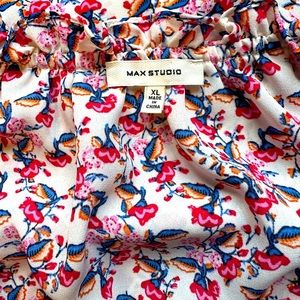 This top has a pretty small ruffle detail around the neck, and flowy very short sleeve. This top has no stretch.