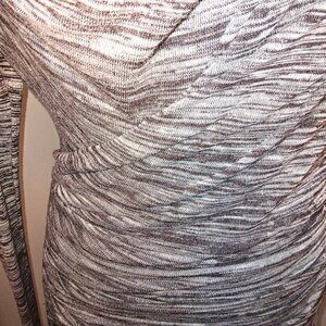 This classy gray and black dress by Max Studio is so comfortable and makes a perfect all occasion dress. It has good stretch and hugs the body for a nice fit.