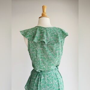 green floral dress, wrap midi dress, ruffle dress, romantic style, cottagecore outfit, garden party dress, wedding guest option, spring summer dress, feminine aesthetic, soft girl style, brunch outfit, lightweight midi, flattering tie waist, classic wrap silhouette, floral midi