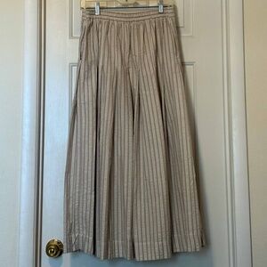 MAX STUDIO LONDON Cotton Striped Midi/Maxi Skirt, Size M. Taupe and cream ticking stripe. Elasticized waist in the back, pleats and POCKETS! Measures 14" across the waist (laid flat without stretching the elastic) and 35” from waist to hem. Pleats are stitched down across the abdomen and hips so there’s no added bulk in that area. NWOT. From a smoke-free home.