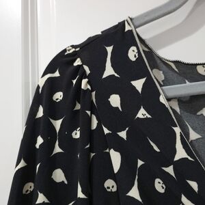 Knee-length dress by Max Studio features a fun twist on the classic black and white abstract polka dot pattern, perfect for casual settings or semi formal events. Polka dots seem to have an abstract skull throughout. The dress boasts a flattering V-neckline with a knot detail and charming puff sleeves, adding a touch of vintage elegance. Its A-line silhouette ensures a comfortable and stylish fit for any occasion. Very lightweight, fresh polyester stretch fabric.