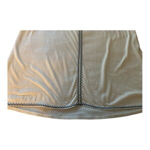 Nice, soft and fresh top ready for warmer weather! All white except for blue embroidery around the neckline, down the front and hem. Vneck, pullover. Perfect for any occasion or layering!