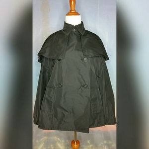 The dramatic silhouette of this caped-raincoat belies its undeniable practicality. Front-flaps that wrap around the shoulders to create a caplet/Double breasted design/Upturned flap pockets/Vertical slits for sweater wrapped arms to peek out from. The memory taffeta fabric is weather resistant and warm, with a luxe look and feel that makes it an easy choice for evening looks or to easily glam up your jeans. Fits true to size.