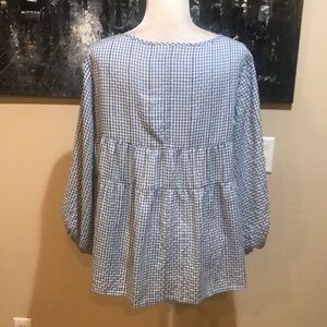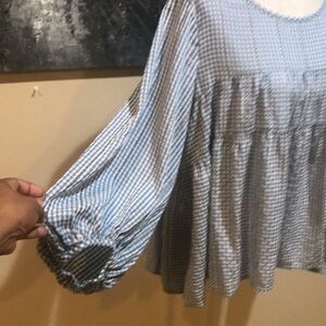 MAX Studio Blue and White Cropped Puffed Sleeved Oversized Peasant Top-M
