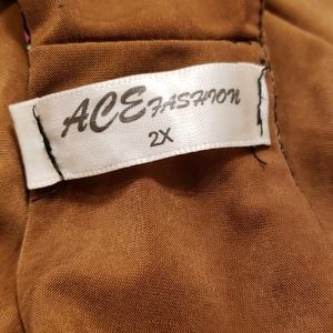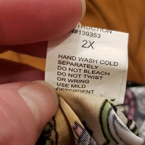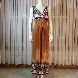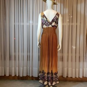 Cool, casual and elegant all at once. Gorgeous maxi dress with a wrap look bodice and a deep V neckline. Rich rusty gold with a beautiful paisley print on the bodice and hem in fuschia, purple, green, gold, cream. Dress it up or down. There are 3 very small spots that blend with the folds of skirt, not noticeable when on, see picture. Price reflects condition, which is great except for the spots.