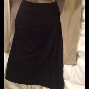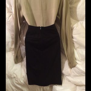 Knee length black sue skirt with lovely faux pleat details. Fully lined, back center zipper closure. Approximate measurements W 30" H 40" L 22". It needs to be cleaned and is priced accordingly. Style for less!