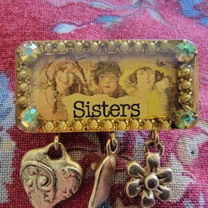 MSRP 60.00 This is a rare vintage pin from Maximal Art.Brand that is brand new,never worn and been stored...the pin has an image of three women in old fashioned hats ...all smiling and happy .It does have a banner which also says " SISTERS" in what appears to be an older type font,beneath the image of the three women.There are also sparkly aurora borealis crystals in the four corners as well as some tiny imitation pearls at the edges for a nice extra touch. Measuring approximately 1 1/8" x 1 1/2" to the bottom of the 3 whimsical charms which include a gold toned scrolled fancy heart, a gold tone slipper with bow or some kind of flower embellishment at the toe and a gold tone flower blossom.This would make a really fun,fabulous and thoughtful gift or a gift for yourself!