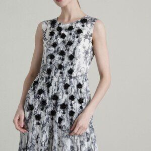 Make a statement with this elegant black and white midi dress, perfect for any special occasion or a chic daytime event. The dress features a delicate floral pattern accented with exquisite 3D black floral embellishments that add texture and dimension, making it truly unique.