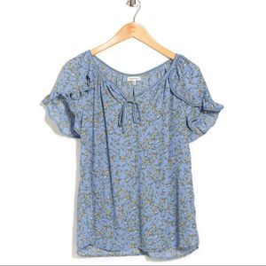 Ruffled tulip sleeves add a charming dose of flounce to this split neck blouse with allover florals.