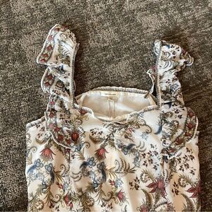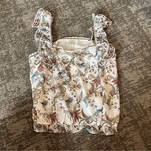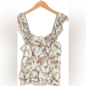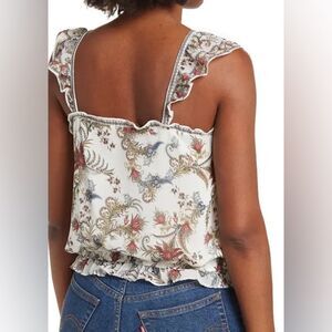 Ruffles trim a square neck cami that is printed with floral inspired filigrees.