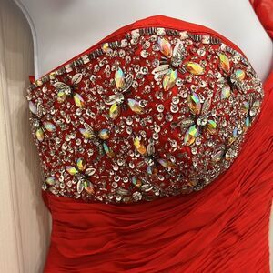MAY QUEEN COUTURE USA DRESS RED PEARL RHINESTONE MIDI ROSE STRAP SZ 12 VINTAGE