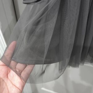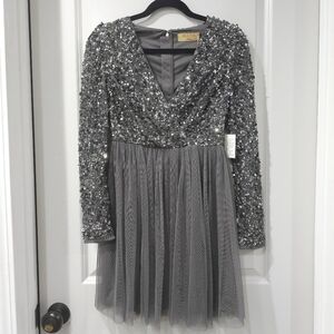 Extremely elegant mini dress with surplice front and long sleeves filled with hand embellished sequins and beads. Bottom half of dress has multi layer tulle over solid lining fabric, which gives a soft feminine touch. Perfect for weddings or sweet 16 parties.