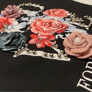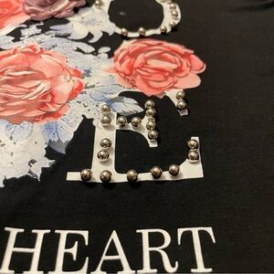 Such a cute top by Maybe Wang black top with silver studs and 3-d flowers so beautiful and love forever heart in print in great condition size small