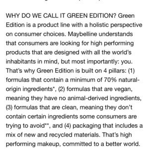 WHY DO WE CALL IT GREEN EDITION? Green Edition is a product line with a holistic perspective on consumer choices. Maybelline understands that consumers are looking for high performing products that are designed with all the world's inhabitants in mind, but most importantly: you.