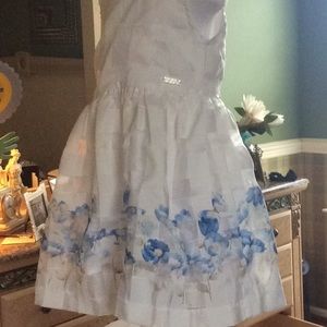 I love this dress size for designer love it perfect condition blue flowers weave through looking over layer bottom cotton underneath