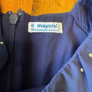 MAYORAL Ruffled Shorts Romper Girls 6 Navy Blue Gold Dot Playsuit Chiffon Jumper
