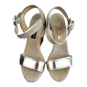MAYPOL Espadrille Wedge Ankle Strap Sandals, 3/4" wedge, 4.5" wedge heel, buckle ankle strap closure, pewter and Khaki in color, previously owned, minimal signs of wear, left shoe toe strap has a small crease, bottom of right shoe heel crack, see pics 1 & 8. Good Condition