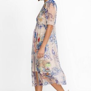Elegant sheer maxi dress with vibrant floral patterns. Perfect for a beach day or casual outing.