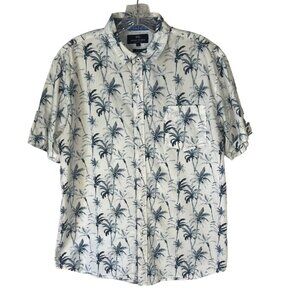 This stylish MB Michael Brandon Hawaiian shirt, in a slim fit size large, features a distinctive palm tree print. Crafted from 100% cotton, the shirt is machine washable, offering a blend of comfort and convenience. Its white and blue color scheme adds a cool, relaxed vibe.