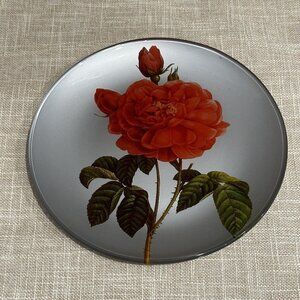 This stunning decorative plate by MBI Home Collection features beautiful hand-painted red roses on a glossy finish art glass. The round plate has a diameter of 8 inches, perfect for any occasion and all occasions. With a floral pattern and a vintage vibe, this plate will surely add a touch of elegance to any room. Made in Italy, this 8" diameter plate is an original and authentic piece from the MBI Home Collection. With beautiful stemmed red rose against a silver metallic background, this plate exudes love, romance, and energy. It is in good pre owned clean condition with some minor use or handling wear, no breakage issues. Please see pictures for more details and measurement.
