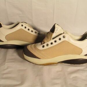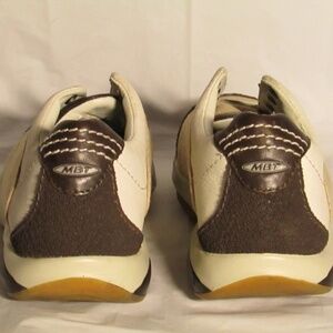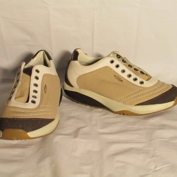 This is a pair of MB sneakers in a beige and brown design. The shoes feature a distinct rocker-bottom sole technology engineered to improve posture, reduce joint pressure, and provide ample cushioning.