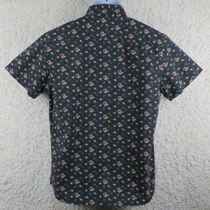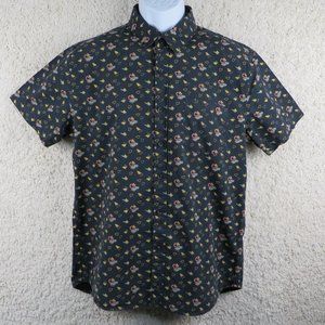 Pre-Owned Condition! 100% Cotton. Handsome Black Button Down Shirt with Multicolor Retro Design Prints and Black Dish Buttons(spare attached).