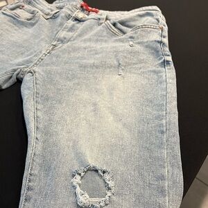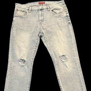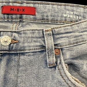 MBX Men's Slim Fit Stretch Jeans. Size 36x30. Light blue in color. Distressed look with holes in both front legs. 5 pocket design. 99% cotton 1% spandex. Machine washable. Very good condition. Like new.