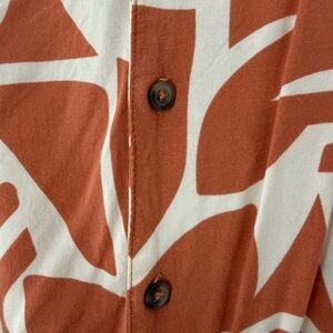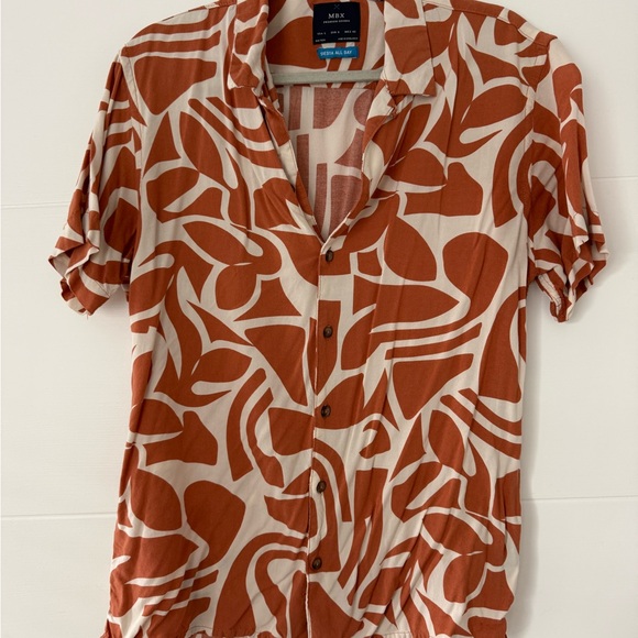MBX rust and cream abstract print short sleeve button-front shirt. Lightweight, breathable fabric with a relaxed fit for everyday wear. Features a classic collar and easy button closure for versatile styling. Perfect with jeans or skirts for a casual polished look.
