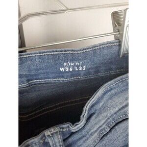 The jeans have a 36-inch waist size, 30-inch inseam, and come in a classic blue color. They also feature accents such as a button, zipper, and logo. These jeans are perfect for any occasion and are a great addition to any men's clothing collection.