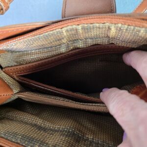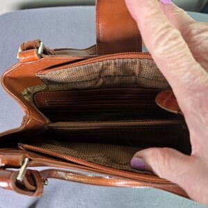 This M.C. handbag features luxe crocodile-embossed brown leather and a striking silver accent clasp. Enjoy practical organization with a roomy multi-compartment interior. Its structured silhouette and vintage vibe make it perfect for chic office looks or dinner dates. No visible flaws—style and quality in one piece. Add a trendy edge to your wardrobe and feel sophisticated every day. Appears unused inside and out. Feel confident and elevate any outfit with this luxurious must-have.