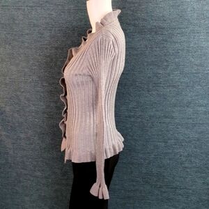 This pretty sweater is lightweight, ribbed, body-hugging, and ruffled. The color seems to lighten up in pictures in the light. The true color is a jersey gray, closest to the picture where it is off the mannequin, and to the close up pics.