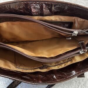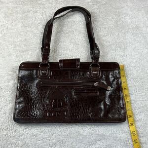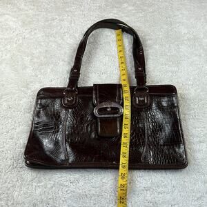 Classic sophistication in this croc embossed brown shoulder bag. Features silver hardware, with triple inner pockets, separated by zipper pockets. Additional standard small inner zipper pocket, as well as back zipper and slit pockets. Lots of organization options.