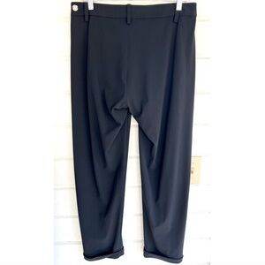 Fabulous variation on the classic tuxedo - with a long asymmetrical sleeveless vest that snaps in the front, paired with slim cuffed pants. The top (Size 8) ties in the back - which provides flexibility in fit and comfort. Pants (size 10) have a tailored waist with belt loops and side pockets with button details.