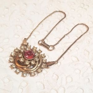 The Necklace portion is removable by the end pieces that you simply push in to remove. The length of the necklace is 15.5" with Pendant/Brooch attached. The Brooch/Pendant measures 1.5" across. The Rhinestones are white with dark Pink center Rhinestone that is European cut. All in excellent Vintage condition. You could even attach the chain to some other Vintage brooches that have openings where you could place the chain into. Doubtful you'll ever see another. A lovely Heirloom Quality Treasure to add to your jewelry wardrobe.
