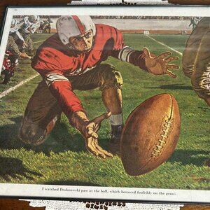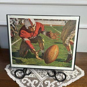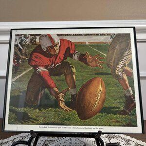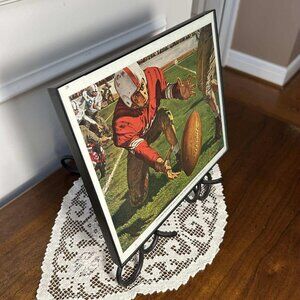 Vintage colored artwork from an early 1950’s Saturday Evening Post story. Framed in simple black plastic under glass. 8” x 10” of Americana mid century sports memorabilia. Hard to find treasure from a simpler time. Check out the no face masks. Yikes!
