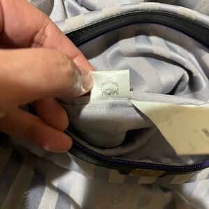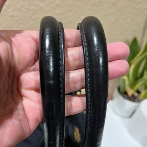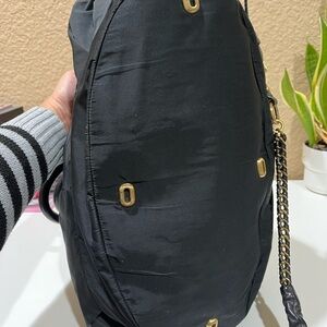 Authentic pre-loved. Made with 100% polyester with cow leather trim. Long strap made of leather and gold chain. Snap-on and zipper closure. Some stains on the inside.
