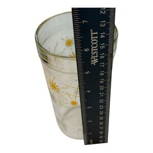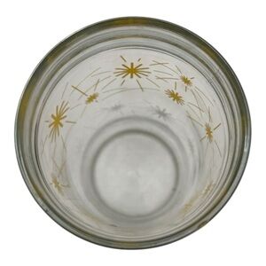 The MCM 50s Vintage Atomic White And Yellow Starburst Glass tumblers are a set of drinkware items manufactured in the 1950s. These retro glasses feature a starburst pattern in yellow, adding a touch of vintage flair to any occasion. Made of glass and reflecting the popular design trends of that era, these tumblers are a unique addition to any collection of drinkware.