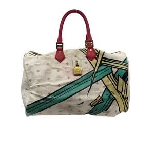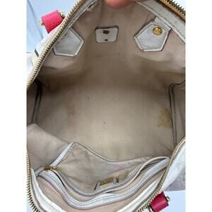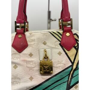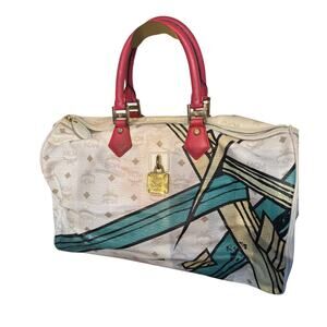 This incredibly rare Richard Woods bag is a collector’s item. Soft leather with hot pink handles, vibrant colors throughout. You can see pink color transfer of handles onto bag. Please review photos of interior. Interior needs cleaning. This bag is unbelievable, a gem, and truly unique.