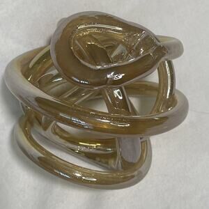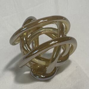 The MCM Abstract Artisan Blown Glass Infinity Knot Sculpture is a modern and artistic piece of decor made of hand-blown glass. The sculpture features an abstract design in a gold color, with a rope glass theme and a hand-blown glassmaking techniqu. It is crafted with a modern style and a 5-inch height, making it a unique and eye-catching addition to any space. The unmarked brand and handmade production add to its exclusivity and artistic appeal.