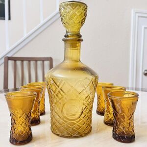 Vintage 8-piece amber pressed-glass decanter set, English-style diamond/waffle pattern. Made in Taiwan, c. 1970s–1980s.