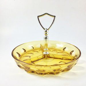 MCM Amber Glass Divided Dish with Handle 8 Inches Across Thumbprint