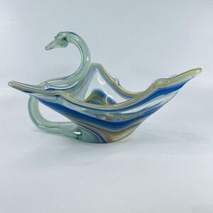 MCM Art Glass Swan Bowl Hand Blown Blue Brown 12-1/2" VTG Dish Mid Century Mod