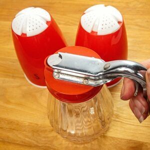 Mid-century modern atomic salt & pepper set in cherry red bundled with a mid-century glass syrup pitcher with a red screw top lid.