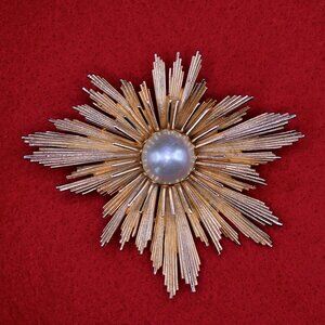 MCM Atomic-Age Starburst Brooch with Pearl Center.
