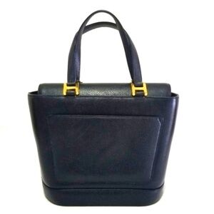 Elegant black leather tote bag with gold accents, perfect for any occasion.