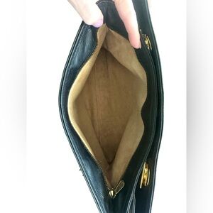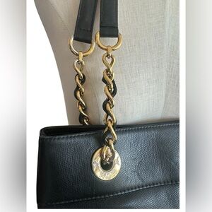 Stylish black leather shoulder bag by MCM. Features elegant gold chain details on hardware and straps. Leather is in great condition, but you will see some of the gold starting to rub off on the hardware. Also note on the gold chains. There is a leather piece that runs in between them and on two of the straps, the leather has slipped out. Please refer to pictures. Not noticeable when you wear it. Overall, a great high-end bag perfect for any wardrobe.