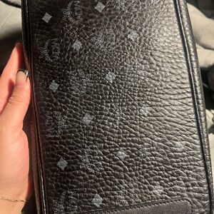 Elegant black leather tote bag by MCM. Features a textured design with sturdy handles.